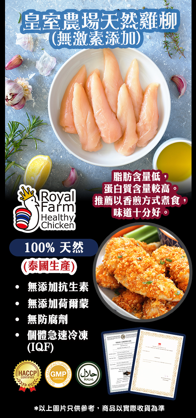 皇室農場出產的雞類產品擁有豐富蛋白質及水份,肉質緊緻結實,脂肪更比一般雞種低,卻不會過少的脂肪導致口感欠佳。皇室農場的雞柳脂肪含量低,蛋白質含量較高。雞柳推薦以香煎方式煮食,味道十分好。而雞柳被切成條狀,也更容易進食,特別適合小朋友及老人家。