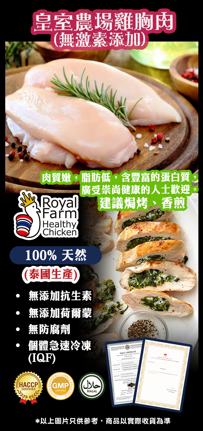 皇室農場出產的雞類產品擁有豐富蛋白質及水份,肉質緊緻結實,脂肪更比一般雞種低,卻不會過少的脂肪導致口感欠佳。皇室農場的雞胸肉,肉質嫩,脂肪低,含有豐富的蛋白質,廣受崇尚健康的人士歡迎。而雞胸肉在冷凍時,攤平放置在輸送帶上,形成片狀,煮食時較易處理。建議雞胸肉可以焗烤、香煎。