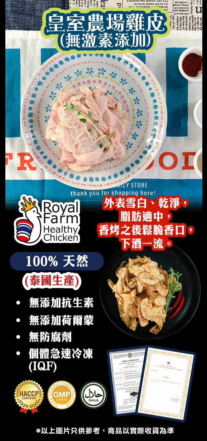 皇室農場出產的雞類產品擁有豐富蛋白質及水份,肉質緊緻結實,脂肪更比一般雞種低,卻不會過少的脂肪導致口感欠佳。皇室農場出產的雞皮產品外表雪白、乾淨,脂肪適中,香烤之後鬆脆香口,下酒一流。