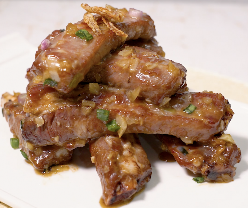 脊骨與腹部的中央位置,即是豬扒斬出來肋骨近骨的部位,俗稱金沙骨,又叫一字排,是豬的肋骨位,蒸燜炸烤焗皆可。