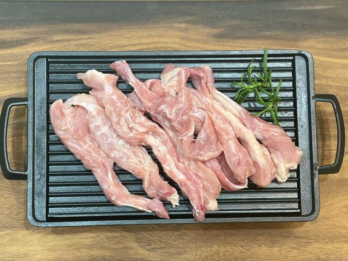 雞頸肉超難取得又珍貴,位於雞脖周邊處的雞頸肉 。一隻雞只有一塊的肌肉,因為這部分是經常轉動的部位,肥瘦交織融合,肉質更具彈性,富有嚼勁,是十分美味的部位,用平煎鍋煎熟起盤撒上椒鹽帶皮帶肉的,口感十足,滋味非常迷人。當然做串燒,雞煲都十分適合。
