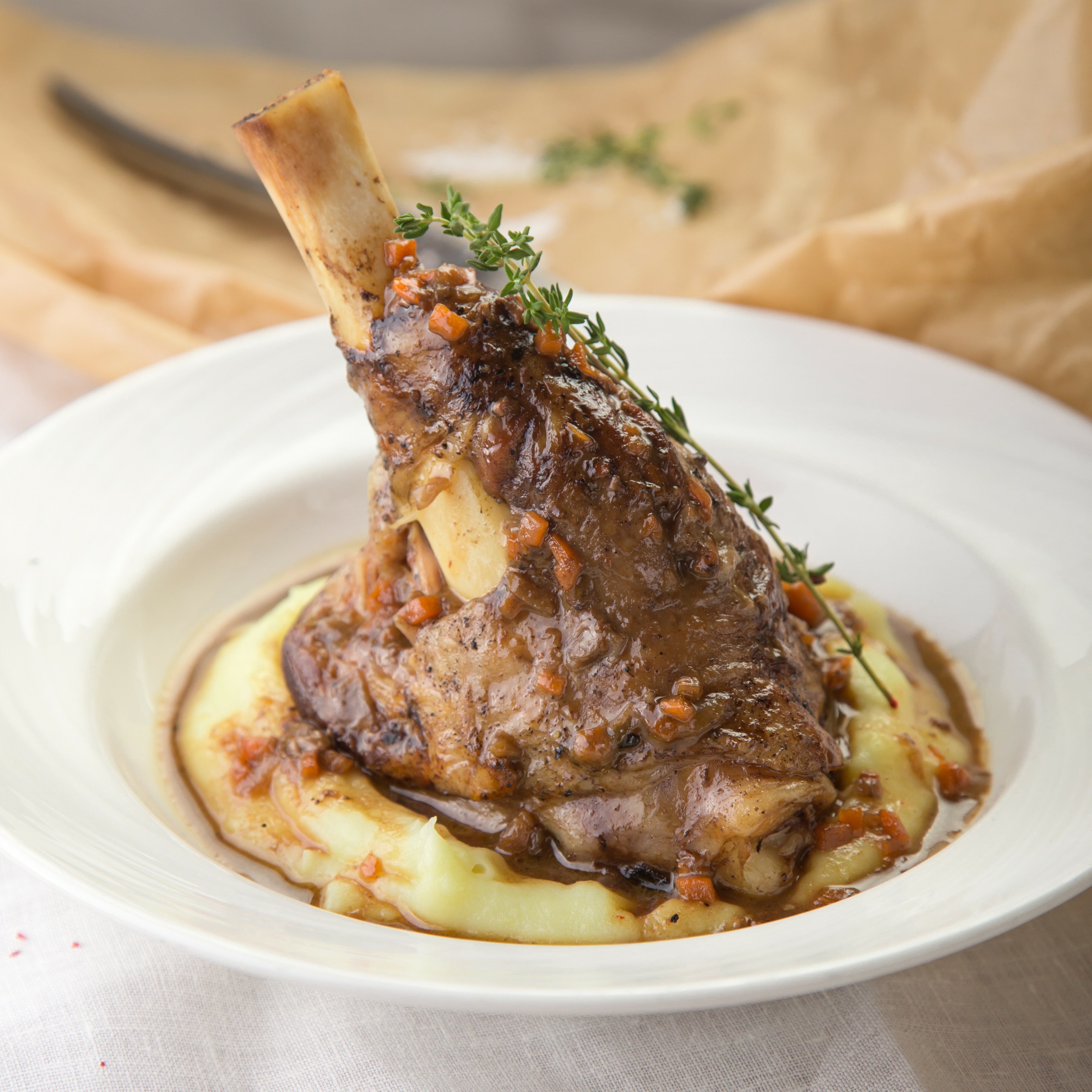 2. 牛油起鑊煎香羊後膝, 加入蘋果、雞湯、黑椒、紅酒、瑞士汁、糖水、鹽用大火煮滾後,改用中小火燜煮1小時30分鐘,即成 ( 炆煮期間定期反動,以確保雙面烹調均勻)